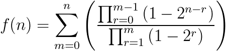 After a bit of research and some fiddling around it became clear that f(n) was equivalent to the summation of Gaussian binomial coeffecients with a q-number of 2. So, what does the final formula look like?